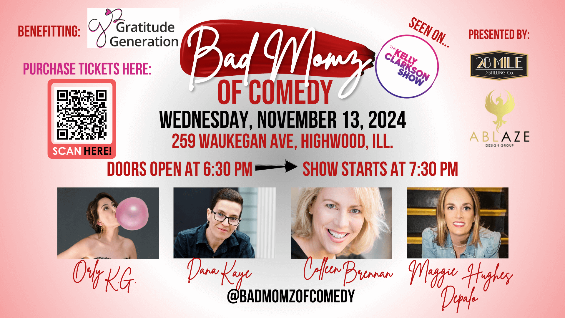 Join us for a ladies night of laughter and fun with the “Bad Momz of Comedy” generously sponsored by Ablaze Design Group & 28 Mile!