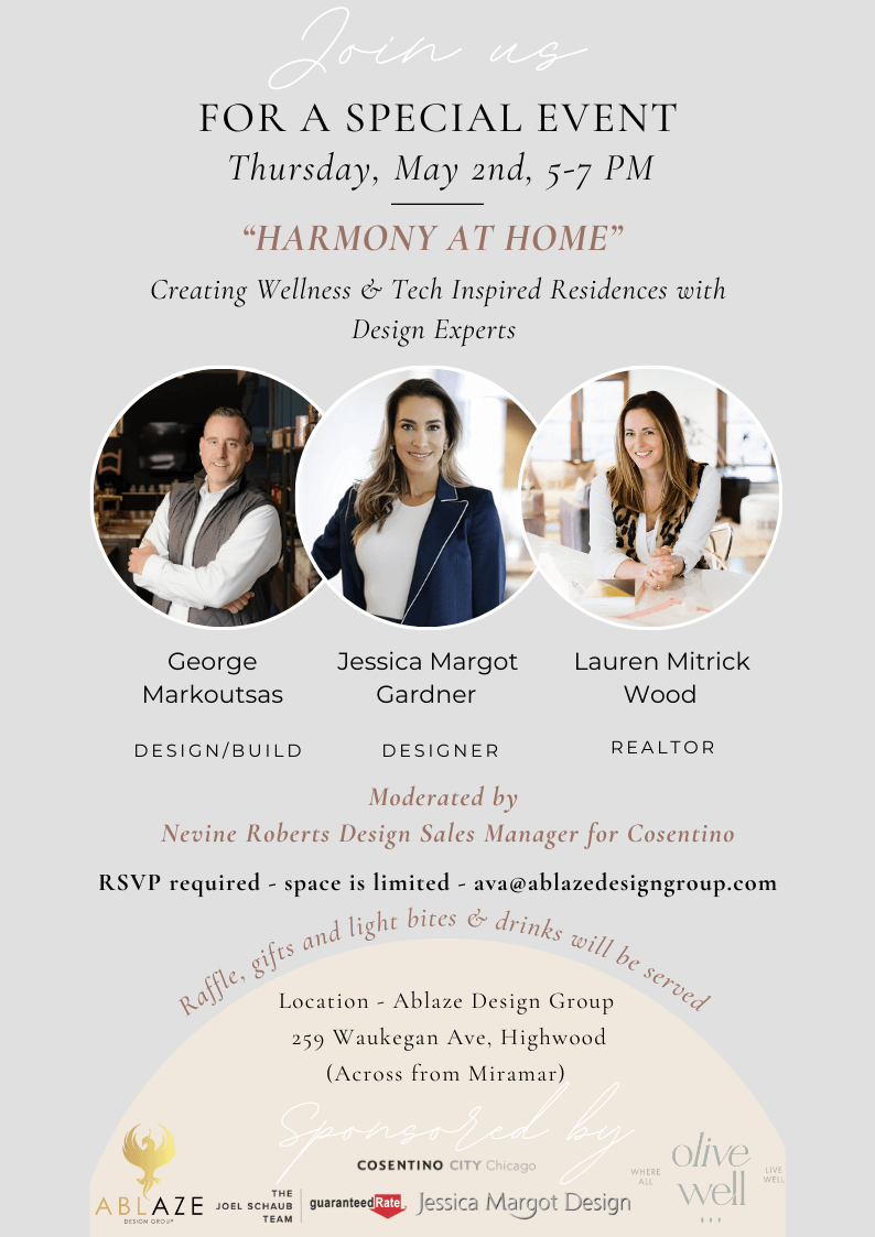 Join us at ABLAZE Design Group for an exclusive panel discussion on wellness and tech-inspired designs tailored for luxury homeowners and buyers. Enjoy lite bites, drinks, raffles, swag, and more surprises. RSVP by April 30th to secure your spot!